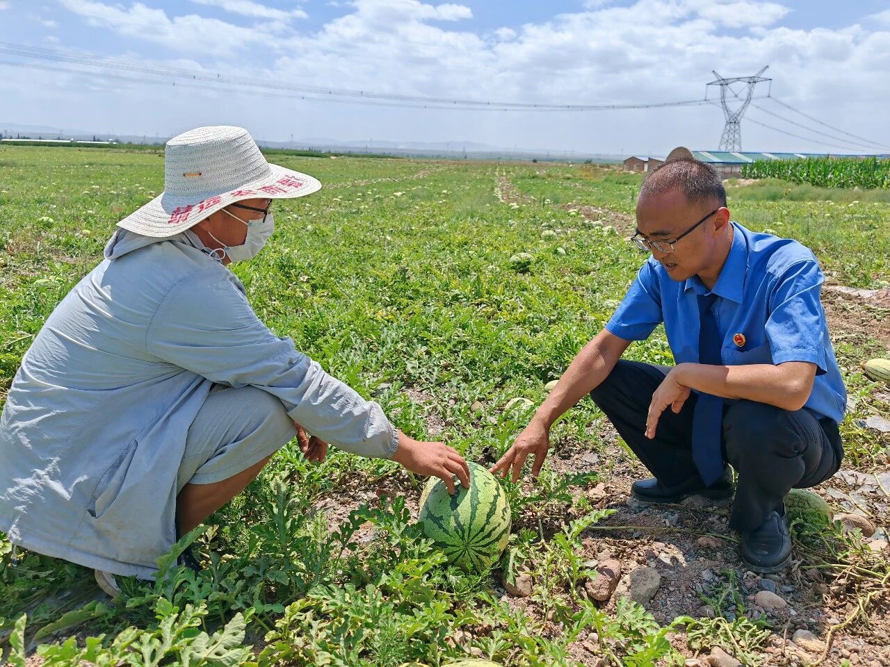 2024年8月,靖远县检察院干警在开展筑牢西瓜产业健康发展专项行动中深入瓜田走访。