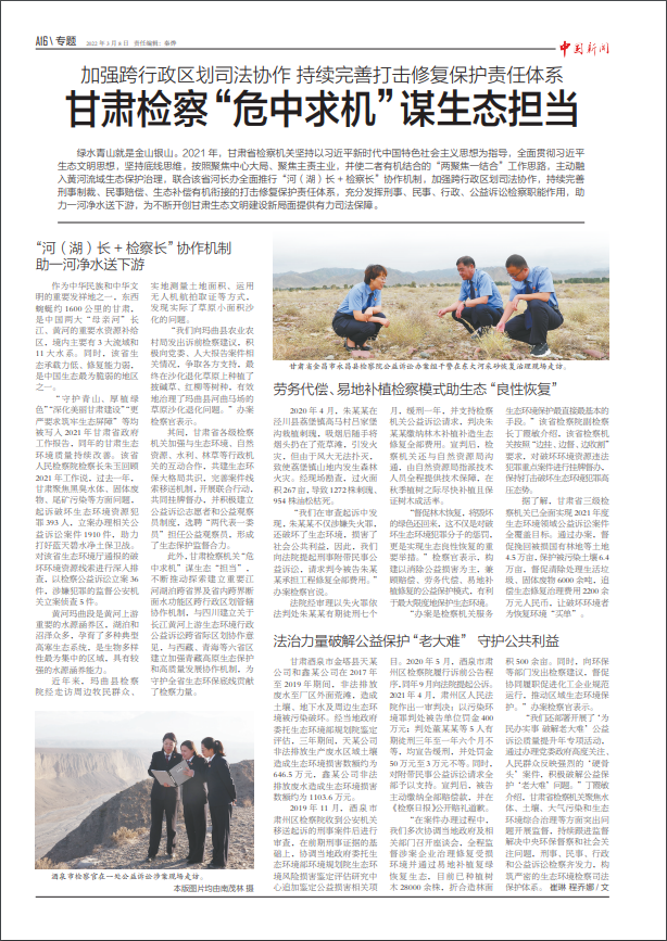 2022年3月8日中国新闻A16版刊发《加强跨行政区划司法协作 持续完善打击修复保护责任体系——甘肃检察“危中求机”谋生态担当》。