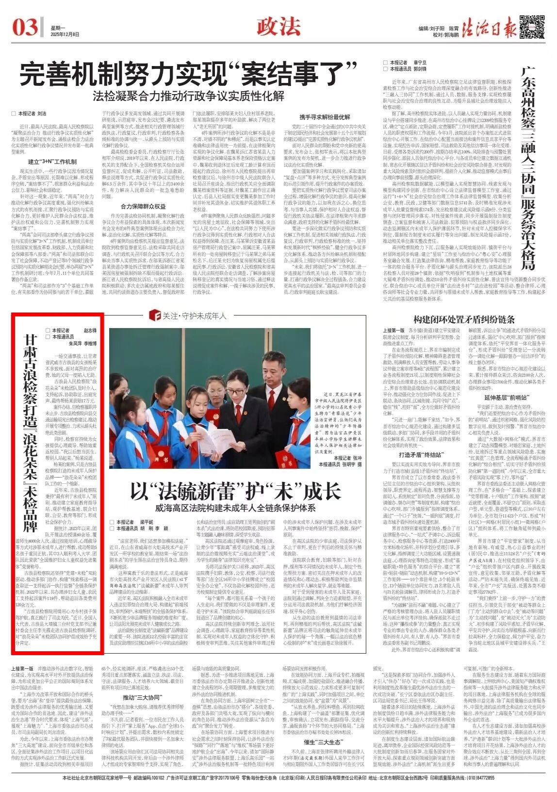 2025年12月8日,法治日报刊发《甘肃古浪检察打造“浪花朵朵”未检品牌》。